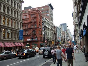 SoHo (Sur de Houston) era el centro de la industria textil después de la Guerra Civil; sus almacenes de hierro fundido albergaban textiles y otras manufacturas ligeras. A mediados del siglo XX, la zona perdió su valor para la industria; los almacenes fueron transformados en grandes “lofts” que se convirtieron en lugares primordiales para estudios de artistas y galerías. En 1973, el SoHo fue nombrado el Distrito Histórico de Hierro Fundido (el único distrito conocido en la ciudad, de lo que no estoy segura si es cierto….) y subsecuentemente llegó a ser residencial. Hoy en día, las calles de adoquines, acogedores cafés y boutiques de moda atraen a muchos turistas y compradores. Los almacenes de hierro fundido del siglo XIX se están reconstruyendo como condominios y edificos corporativos, y ofrecen un estilo de vida lujoso en el corazón de Manhattan.