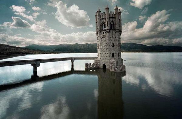 No, Madrid. En 1907 Alfonso XIII inauguró el embalse de Santillana, construido sobre el cauce del río Manzanares. Para rematar la presa los arquitectos diseñaron una torre de estilo-gótico plateresco que sirviese de anticipo al castillo medieval que se encuentra al otro lado del embalse. En los años 60 se había quedado pequeño y se levantó una nueva presa delante de la antigua aunque sin conservando ésta. De este modo la torre se quedó en mitad del lago artificial, y ahí lleva más de un siglo viendo subir y bajar el nivel de las aguas.