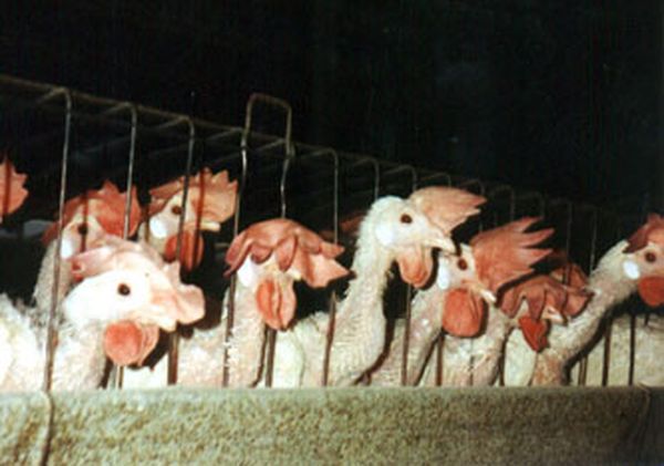 - Vivir apiñado en jaulas inmundas e infectas, con 24 horas de luz artificial para aumentar la productividad. Pinchándome los ojos para dejarme ciego. Bebiendo agua llena de mierda y orines de mis congéneres etc. Con la única finalidad de esquilmarme la salud día tras otro. Para que no pare de poner huevos y después ser escaldado, desplumado vivo, y por fin triturado para terminar mi existencia en forma de cubito de caldo -o lo que es peor- en pienso para que se lo coman los toros señoritos… Como pasa con las gallinas.