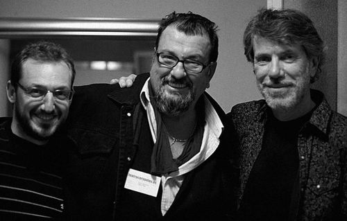 Así que este amigo, va y me proporciona una serie de fotografías que conformarán la parte visual de este trabajo. Pero no queda eso ahí. También Carlos L. Linares, me proporciona a través de Carlos Germade (Hermanas Sister) la música apropiada y original del concierto. Para terminar de la mejor manera, otro amigo, José Moreno Ceano, contribuye con una foto que nos tiró a Gonzalo, al propio Father y al Saxo- flauta de Tabletom: Agustín Carrillo, en los camerinos del citado Teatro Cervantes una vez finiquitado en concierto. He citado por orden de izquierda a derecha.