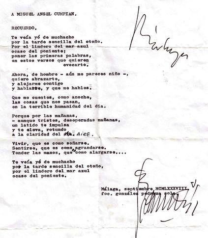 Atesora muchas sorpresas este literario amigo. Así, durante la velada, y en una conversación sobre mi intención de realizar algún día una entrada sobre Paco Pedraza, me proporcionó un impagable poema dedicado a él; a Miguel Ángel.