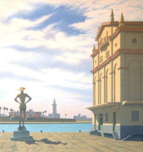 No muestra estridencia chillona alguna en sus pinturas; todo lo contrario, trabaja adrede una cierta palidez y opacidad a sus trabajos que le confieren una atmósfera, algo nebulosa. Los sitios están elegidos magistralmente; Calle Varela, Calle España. El precioso Carril de la Pimienta. Rincones ocultos del patio de los naranjos en la Catedral… Preciosa villas perfectamente reconocibles. Y un silo del puerto custodiado por un Quijote que vigila, desde lejos, a la Farola. Un Quijote, al que sólo le faltan los cenachos para obstinarse aún más en su malagueñismo.