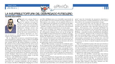 Miren Uds. yo –por esa característica de ignorancia futbolística– padezco lo que se llama la insufrible tortura del desapegado futbolero. Aunque no se crean Uds. que no siempre fui así. Mi cultura futbolera se pierde en los tiempos de los campos calamitosos de tierra y poca hierba que nos daban cobijo, en esta ciudad, a los chavales de la época: Los tres campos del «Lejío» : El Manú, El Manó y el Maní. El Campo del Agua que estaba en Fuente Olletas, el de los Campos Elíseos por el Cementerio Inglés, el de La Fuente en Capuchinos o el de Barcenillas, donde mi amigo Santi me abrió la cabeza de un certero «ñosclazo». Ahí, con esa pedrá –acabé en la Casa de Socorro de Lagunillas chorreando sangre– se me fue yendo la afición al fútbol para siempre.