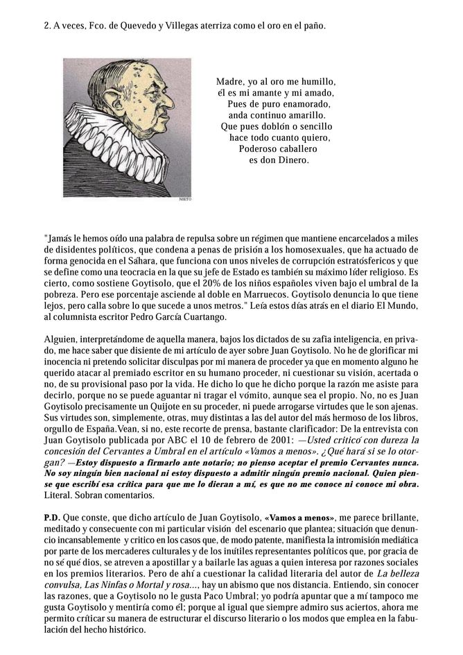 - ¡No!. Estoy aquí, con vosotros. Más alto, más espigao que un arenque, más renegrío que nunca. Vivo en mis cantes y en el corazón de aquellos que los recuerdan y aman, aunque mis huesos de pobre, allí en San Rafaé, en el fosal común del Batatá, estén regüertos con otros tan míseros como los míos y sin una humilde lápida que recuerde cuánto os di y cuánto os doy todavía.
