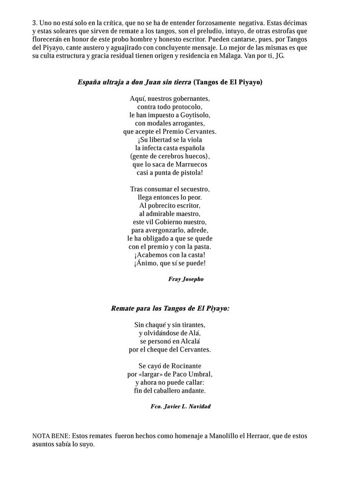 Comentándolo con amigos y familiares, salió a relucir también un texto que el Poeta (siempre lo pongo en mayúsculas cuando me refiero a él) Juan Miguel González del Pino incluyó en el libro El Compás y el Lápiz; un libro aquel publicado por la Diputación Provincial de Málaga, con motivo de la I Bienal de Flamenco- cuyos autores fueron: Ángel Idígoras, el mencionado Juan Miguel González y Javier López Navidad. A la sazón, los tres, queridos y admirados amigos de este probo Father Gorgonzola.