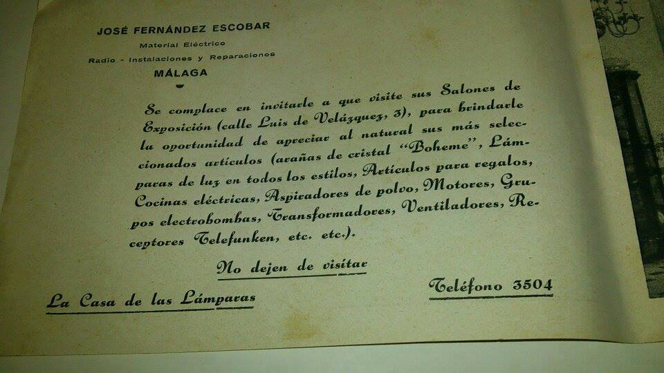 Apostilla del Administrador del blog: La Tienda Fernández Escobar «La Casa de las Lámparas» fue un negocio -que al estar muy próximo al domicilio de mi niñez, sito en la Plaza de los Mártires- forma parte muy importante y querida de aquellos tiempos. La amistad del propietario de dicha tienda, con mi padre (recuerdo haber ido allí en muchas ocasiones) y la posterior mía con sus hijos Salvi, Carmen y Antonio Fernández Laporte, la hacen aún más entrañable y especial para mí.