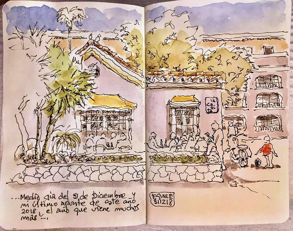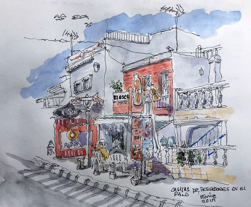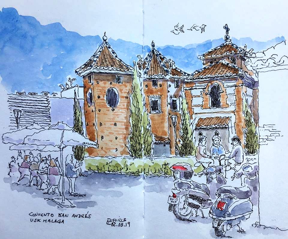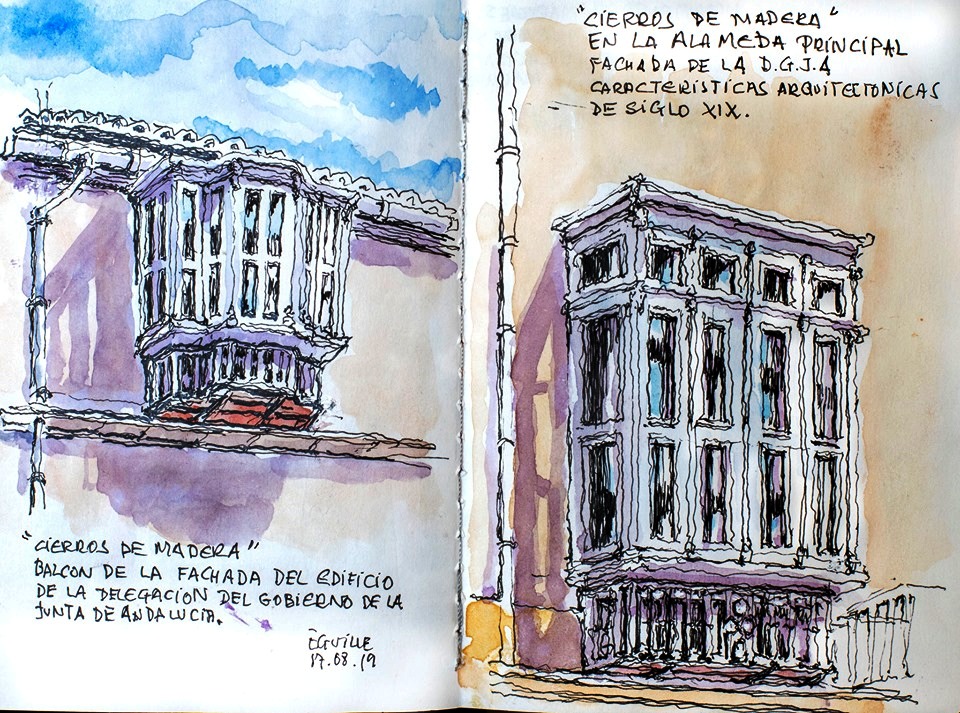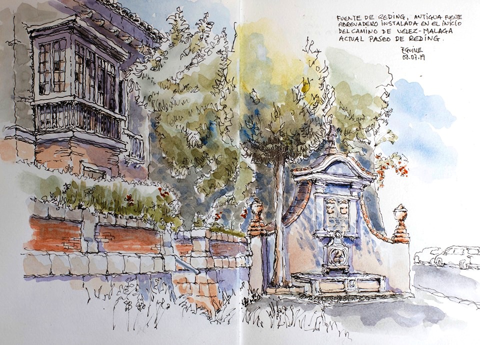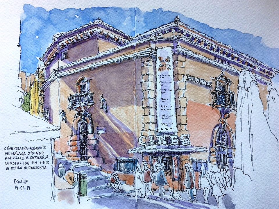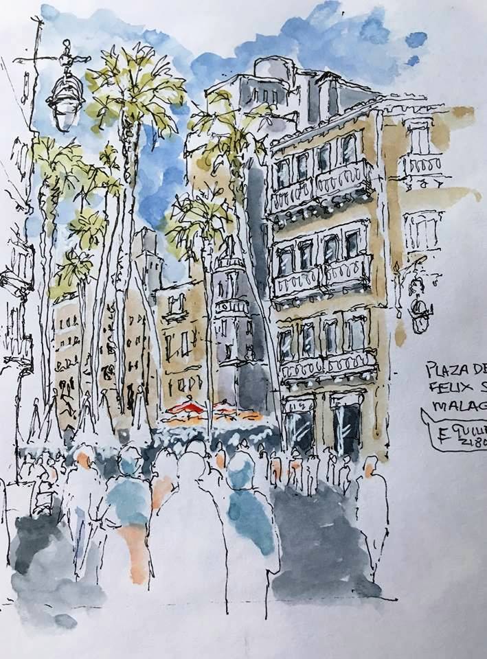 Tengo una especial predilección por la técnica artística pictórica denominada «Urban Sketcher». Muchos la conocerán. Me introdujeron en este ámbito dos queridos amigos  –ambos máximos exponentes en el grupo de Málaga– como son Javier Rico y Luis Ruiz Padrón.