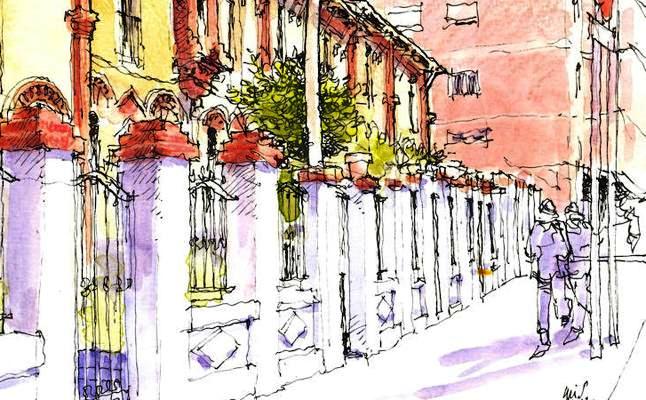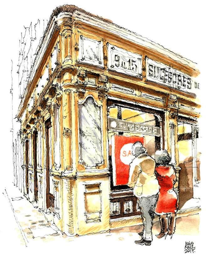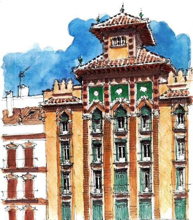 Detenerse y mirar hacia arriba tiene recompensas. La ciudad agradece la gentileza y nos corresponde proponiéndonos un juego. En este caso no uno, sino dos. La elección puede inclinarse del lado de la papiroflexia, como muestran las pajaritas enfrentadas del azulejo de la segunda planta, o del tangram mediante el cual parecen estar compuestas las figuras. En cualquier caso es un privilegio reservado a aquellos capaces de sustraerse de las prisas por un instante y con receptividad suficiente como para captar los guiños que nos dirigen las fachadas. Se desconoce el nombre del arquitecto que hace un siglo diseñó el edificio mostrado en el dibujo, pero no cabe duda de su sentido del humor.