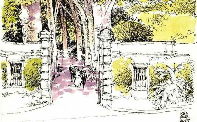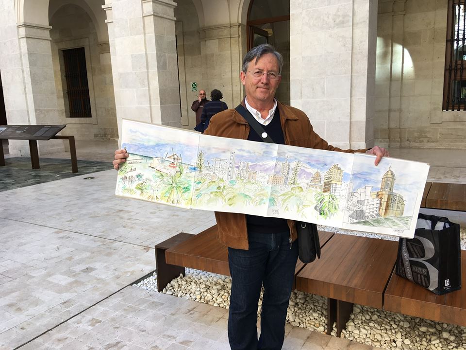 Pero sí que puedo indicar  –porque siempre hay una excepción– que sí hay alguien que en su especialidad destaca especialmente. Alguien que me fue presentado por un amigo del alma. Ese alguien, es mi admirado afecto Luis Ruiz Padrón. Luís, Doctor arquitecto, columnista de prensa, y representante máximo del movimiento Urban Sketcher en Málaga, es un Maestro en lo suyo; además de ser una persona generosa donde las haya y que, manifiestamente, dispensa un trato tan cordial cómo educado a todo el mundo. Tan atento cómo tremendamente ilustrado. Único en ese estilo tan fresco, preciso y detallista que resulta de pintar en el exterior sin la complicidad de la soledad, la tranquilidad y el silencio.