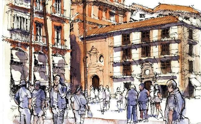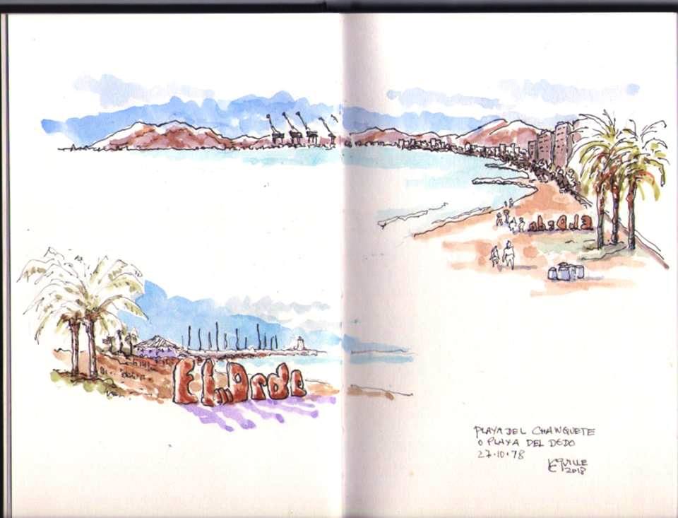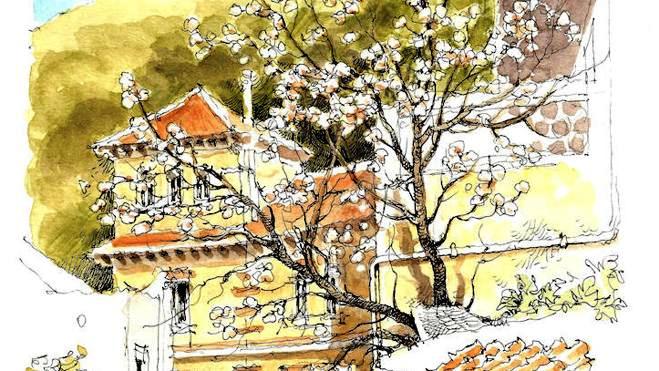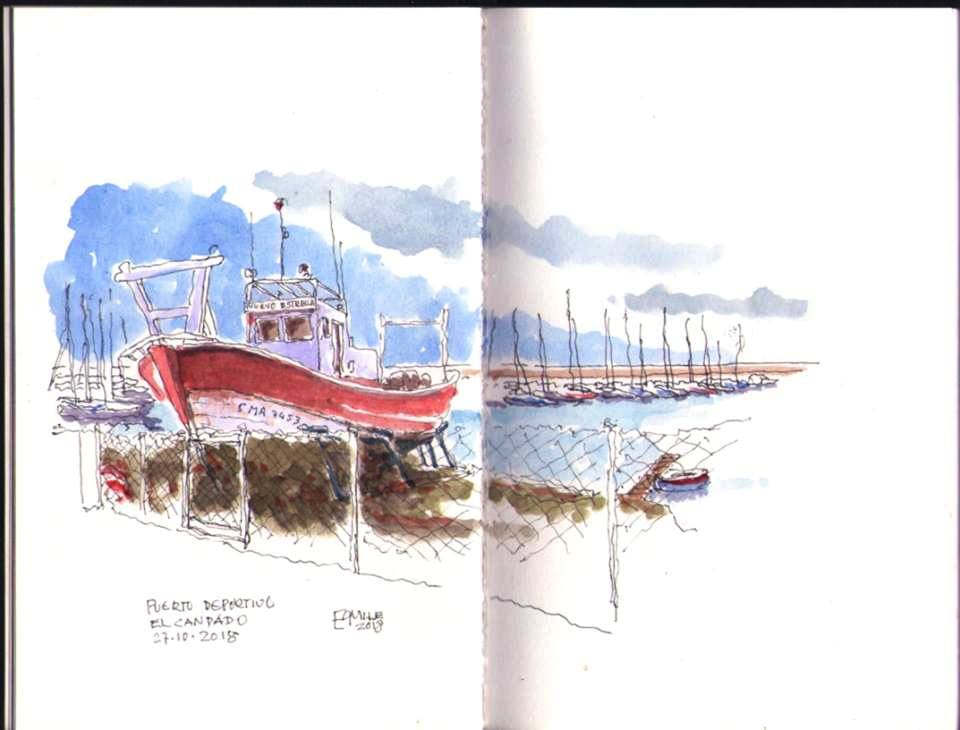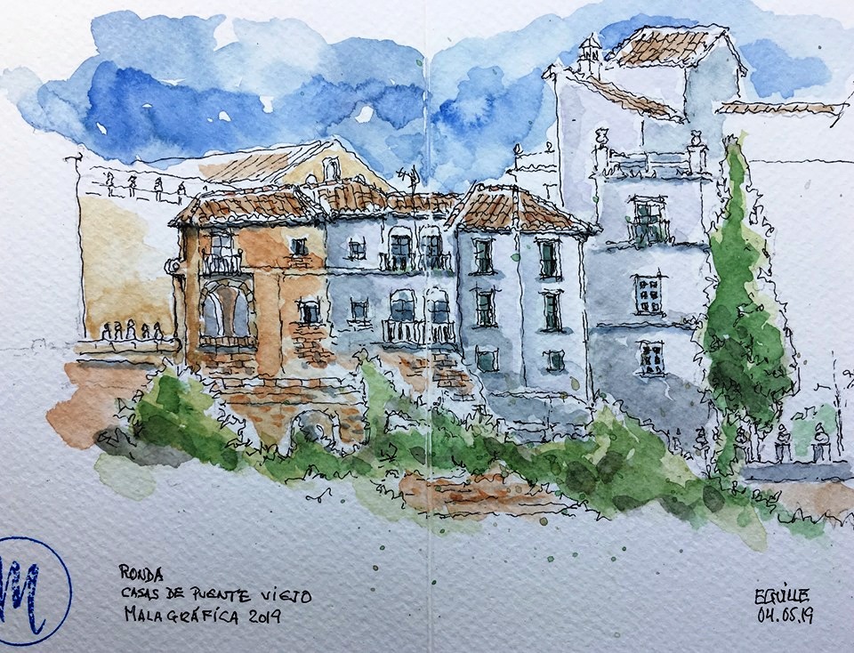 La frescura de dichos dibujos, la inmediatez en la realización y el colorido del resultado, me cautivaron desde el primer de los primeros momentos. Ya saben que dichos trabajos se realizan a pie de calle y sobre unos cuadernos (las muchas veces sin sentarse) y empleando trazos que retratan el paisaje elegido y que se visten de colores a base de aplicar acuarela al dibujo resultante. Todas esas circunstancias: La frescura, la inmediatez, el colorido, y, sobre todo, la franca camaradería que se respira en estos grupos de amigos artistas, hacen –ya lo he dicho repetidamente– que sea un impenitente y fervoroso admirador de esta interesantísima técnica y de sus preciosos y apreciados resultados.