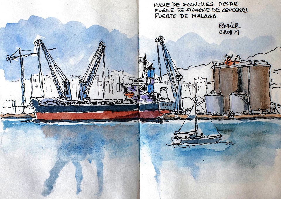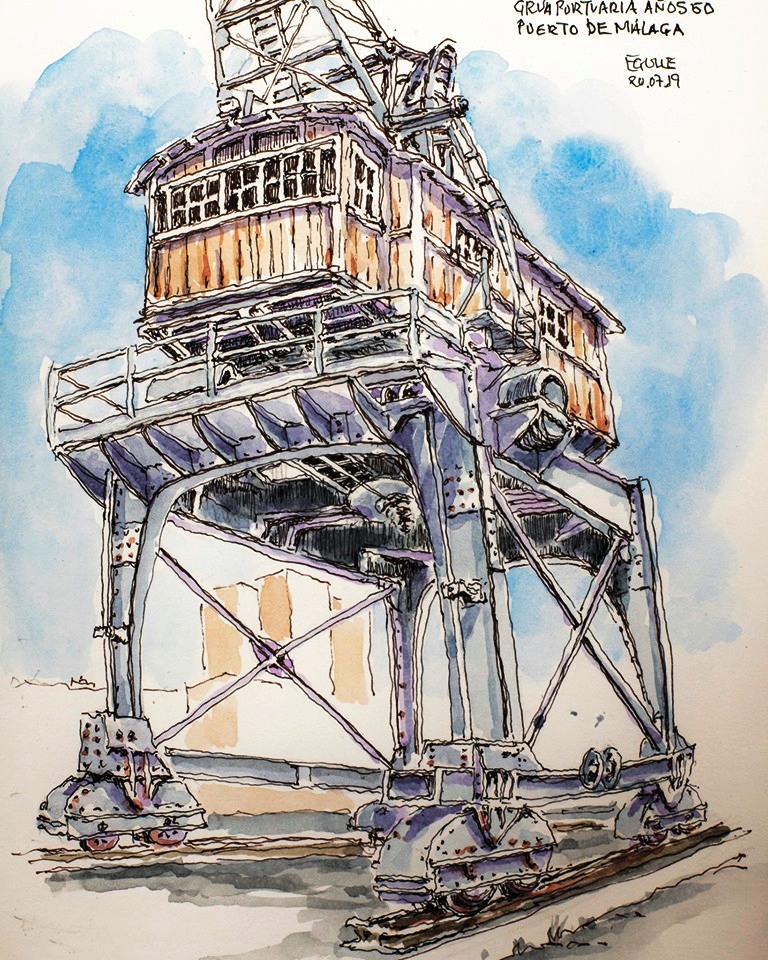 Luis, acaba de presentar en nuestra librería de cabecera «Mapas y Compañía» su último trabajo «Málaga Choréographie Portuaire» –una selección de dibujos del puerto de Málaga– al que sin duda le auguro un papel principal como regalo en esta navidades. Pues bien, también está realizando cada domingo en el Diario Sur y para nuestro regocijo, su particular visión (con dibujos y textos) de una Málaga arquitectónica que, las muchas veces, se escapan de la mirada profana del viandante, más ocupado en las prisas y la impaciencia que en el paseo observador y sosegado.