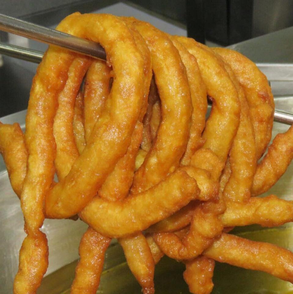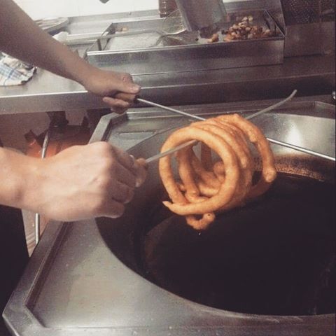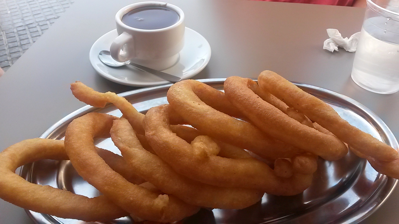 Los tejeringos: Esa deliciosa masa de harina y agua frita con la peculiaridad de presentarse en enormes lazos que, antes, se ensartaban con un junco para facilitar su transporte. Me gustan mucho las churrerías típicas; mi favorita siempre fue «La Cacería» en la calle de noble nombre de Blas de Lezo. No me gustan la nueva hornada de churrerías franquiciadas (están ricos, no lo negaremos) donde la denominación de «Bar de Churros» de toda la vida se ha sustituido, con una pretendida sofisticación,  por un nombre leído al revés y con un inapropiado apostrofe o genitivo sajón que le da un toque de modernidad que no le pega nada.