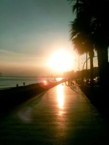 El paseo, que ya he dicho que empieza en el Balneario del Carmen, nos regala varias cosas. Lo primero -me refiero a esta época del año- es el paisaje que proporciona el atardecer de Málaga. Tres colores se juntan en el mar: el verde, el amarillo y el azul oscuro complementando las preciosas vistas de la Sierra de Mijas con la Cañada de los Cardos que, como siempre, es la encargada de anunciar la posibilidad de lluvias o no sobre la capital. El mar, que rompe sobre la arena a nuestra izquierda, nos libera de las tensiones propiciadas por estos malos tiempos duros, intolerantes y mal nacidos que no pocas veces son el centro de nuestros comentarios.